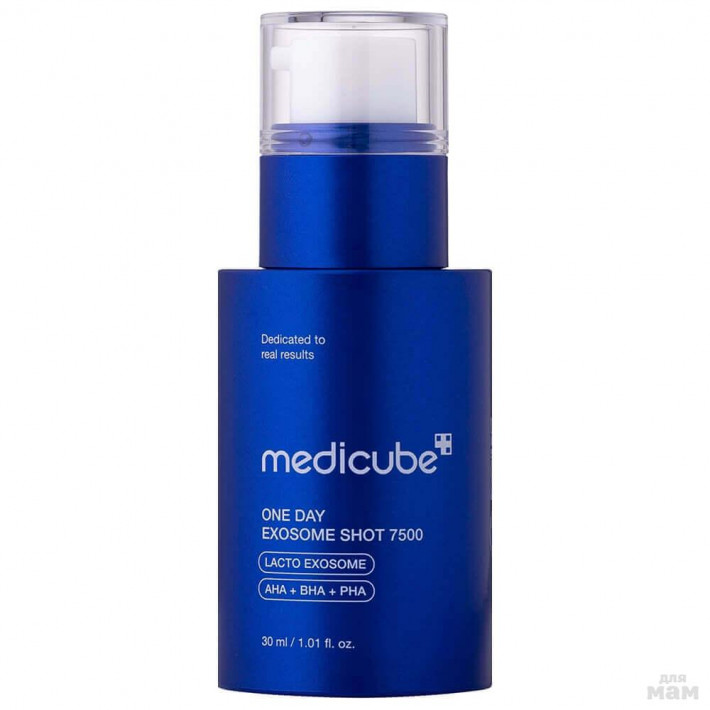 Интенсивная ампула medicube One Day Exosome Shot 7500 помогает в борьбе с чёрными точками, препятствует появлению комедонов и жирного блеска.