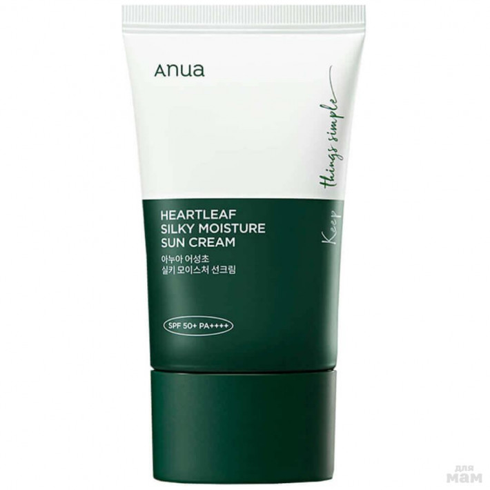 Успокаивающий солнцезащитный крем AnuaHeartleaf Silky Moisture Sun Cream SPF50+ PA++++ предотвращает повреждение клеток ультрафиолетом, смягчает и увлажняет, отлично впитывается без белых следов, предотвращает появление жирного блеска.