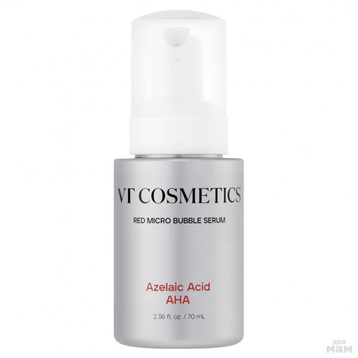 Пузырьковая сыворотка VT Cosmetics Az AHA Red Micro Bubble Serum отшелушивает и смягчает текстуру кожи, выравнивает тон и сокращает воспаление. Регулирует выработку себума, препятствует образованию комедонов и осветляет сальные нити.