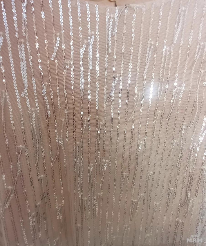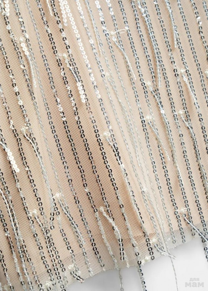 Верх из тонкого фатина с декоративными пайетками, на подкладке, свободная посадка, прямой силуэт, длина до талии, короткие рукава-крылышки, круглый вырез горловины с застёжкой-капелькой сзади.