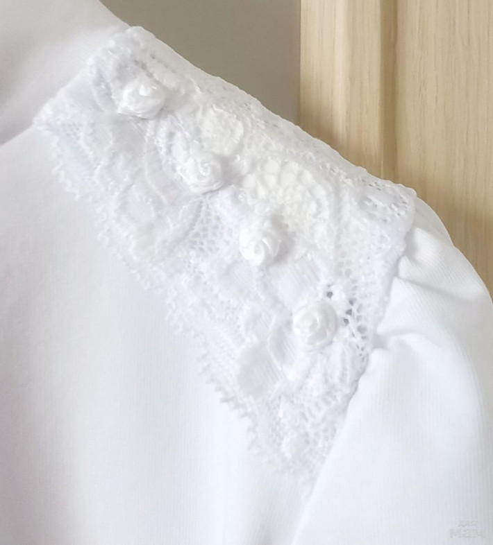 Воротник-стойка, присборенный рукав. Украшена кружевом на плечах и розочками на плечах и рукавах.