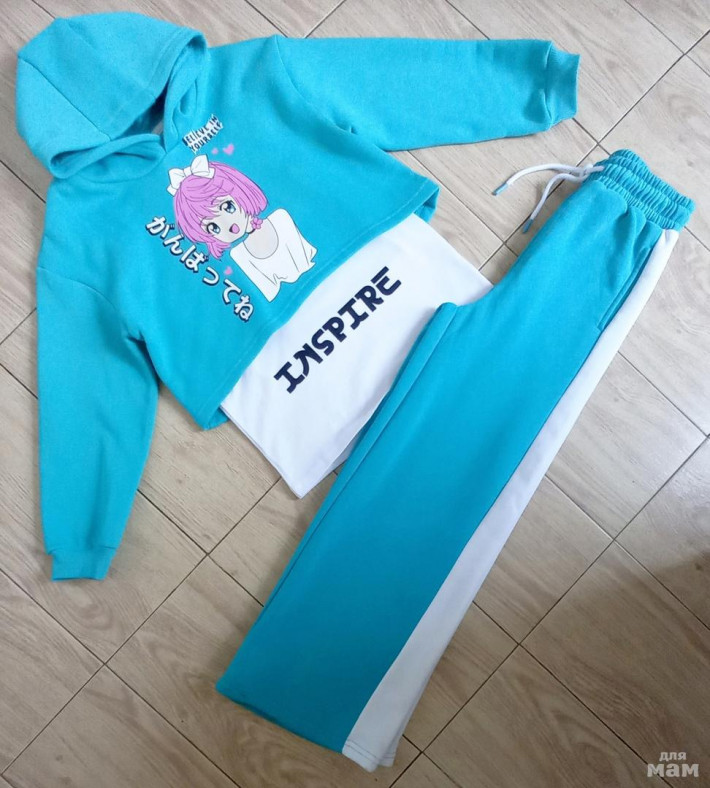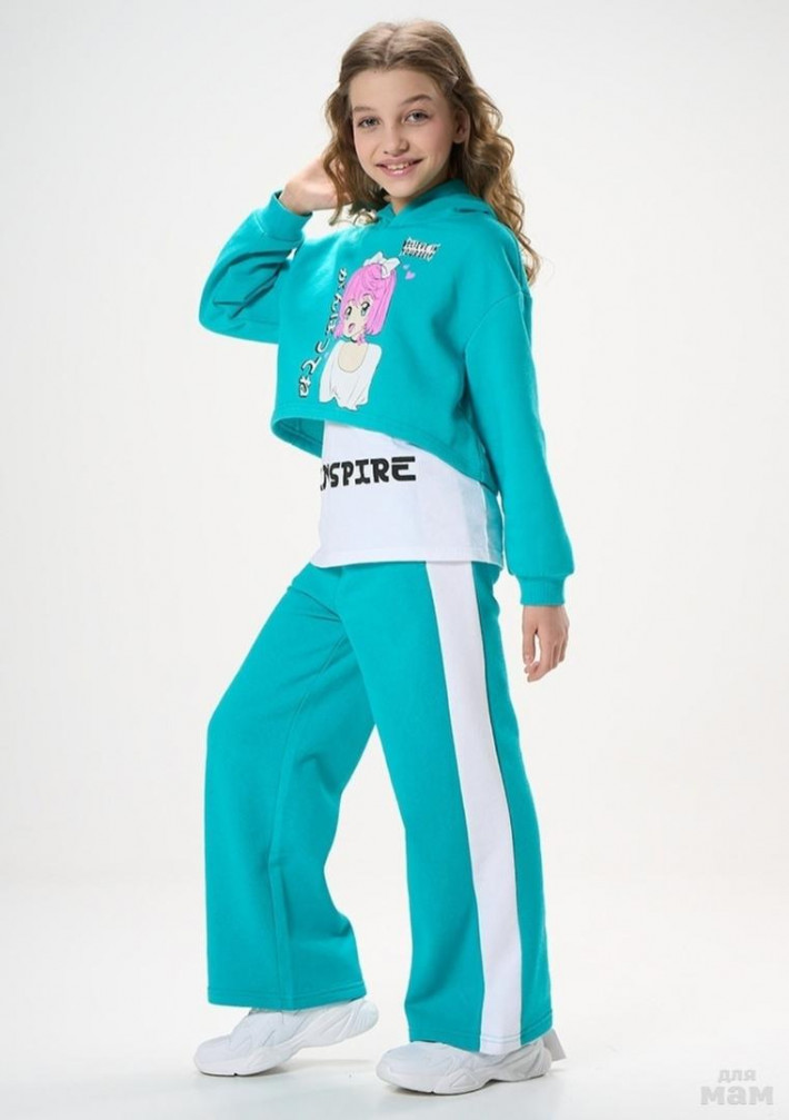 Крутой трендовый утеплённый спортивный костюм из футера с начёсом KARI р.134-140. Цвет: бирюзовый/белый. Состав: хлопок/полиэстер.