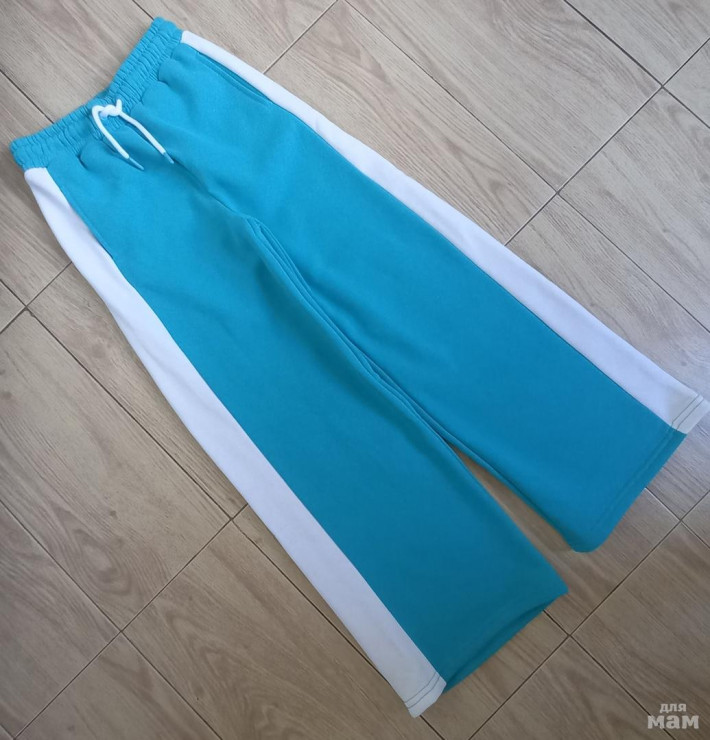 Широкие брюки палаццо с широкими белыми лампасами по бокам. Пояс на широкой резинке со шнурком-кулиской.
