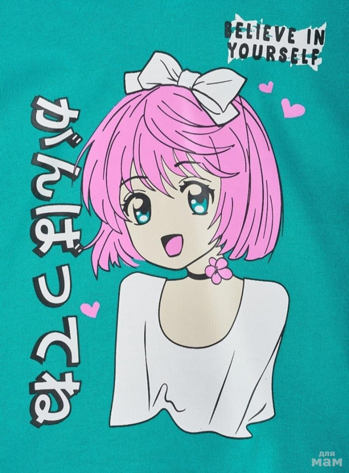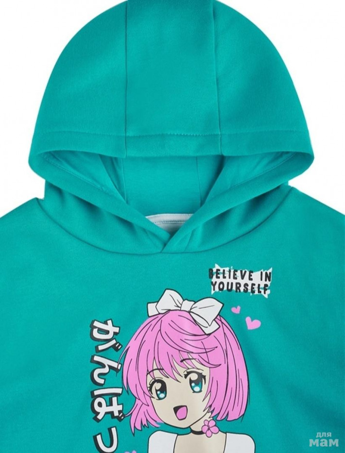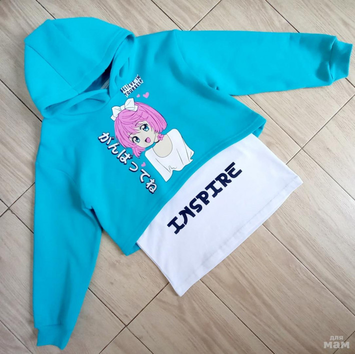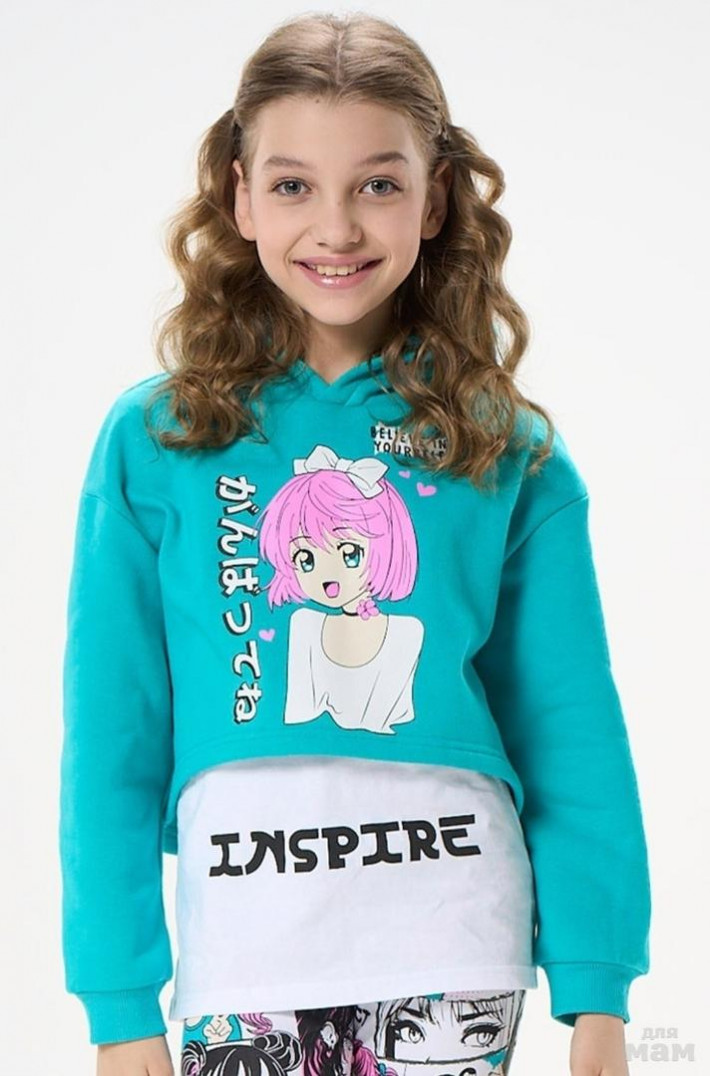 Двухслойное укороченное худи с капюшоном и вшитой футболкой. Яркий принт анимэ на груди.