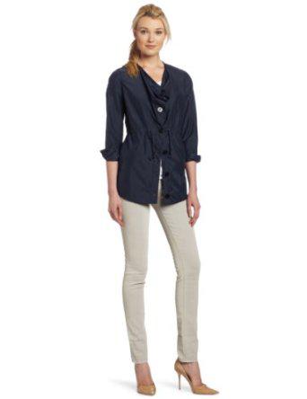 Легкая ветровка без подклада. Не избитый оригинальный фасон рубашечного кроя, без воротника, интересная укладка горловины. На талии шнуровка, слегка завышена, на манжетах пуговицы. Хороший вариант для летнего вечера.
