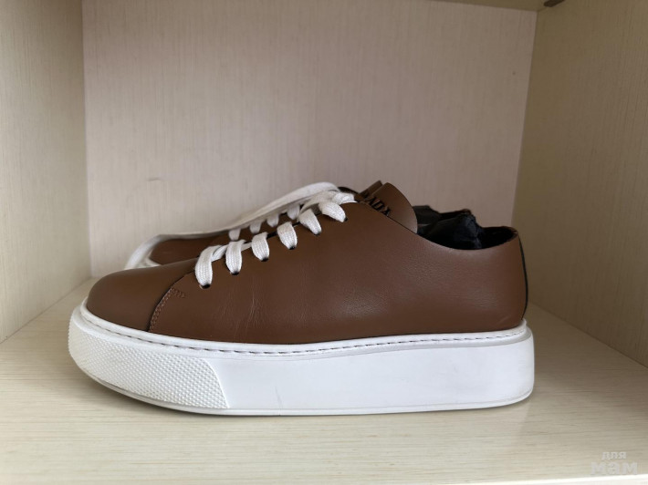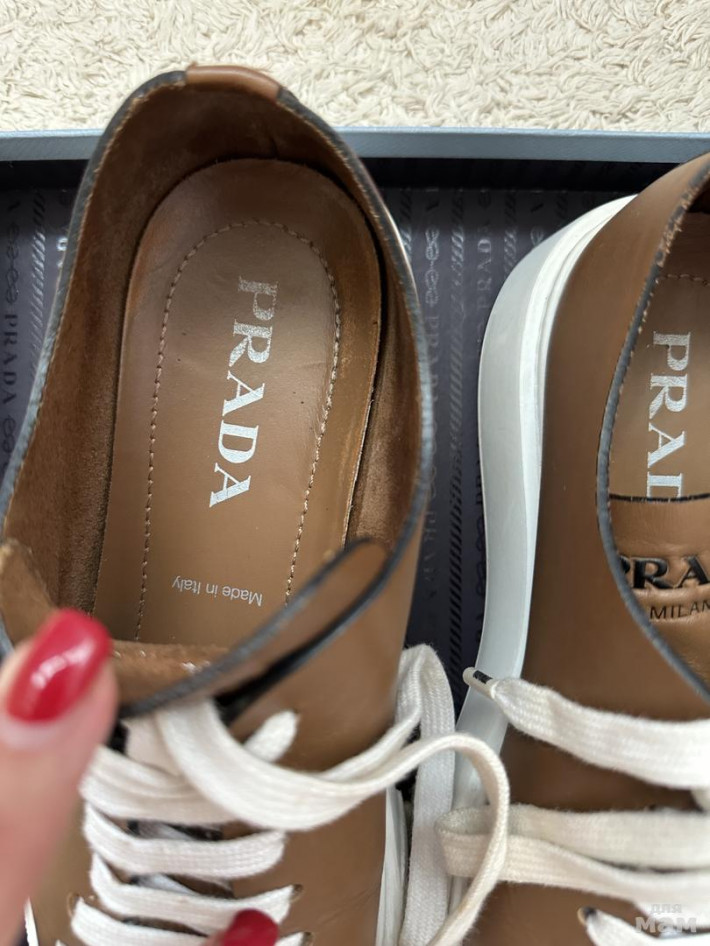Самые удобные и мягкие из всех моделей от PRADA 👍🏼! Мягкая кожа , наиудобнейшая колодка , благордный цвет , их даже не ощущаешь на ноге . У меня размер 38,5 , взяла 39 думала как все кеды чуть маломерки , но оказалось , что они прям точно в размер на 39 , у меня в них болтается пятка при носке ,когда мерила не поняла этого сразу , носила их немного , от черного носочка остался небольшой закрас на стельке внутри под пальцами , видно когда достанете стельку .Состояние 👍🏼. Весь комплект( может и пакет сохранила не помню )