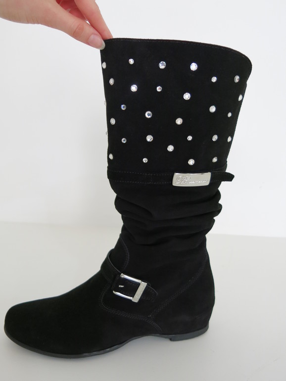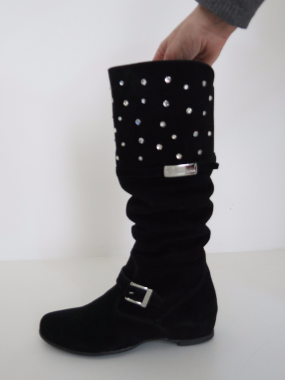 Замшевый сапог Miss Blumarine .Модель присобранная ,Сверку россыпь камней .Скрытый небольшой каблучок .Цена 8900 руб . Размер 36-40