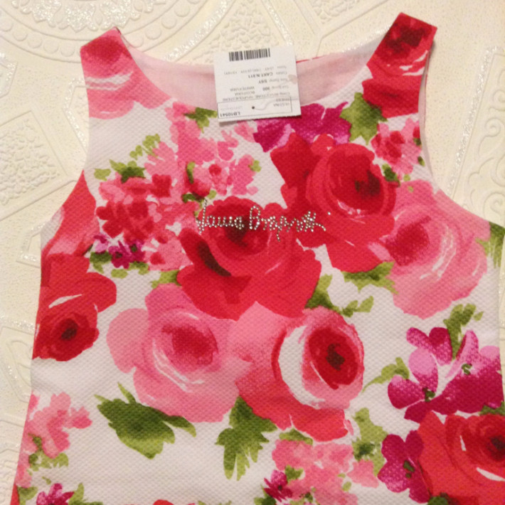 Платье на подкладе из фактурной ткани. Очень яркой расцветки. Логотип из страз.