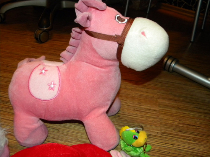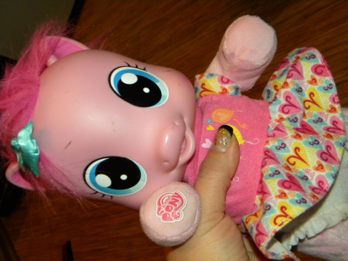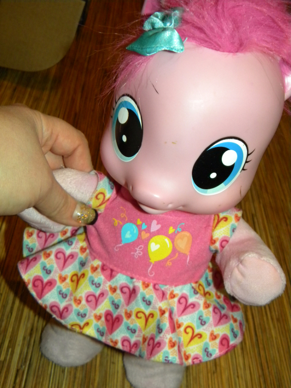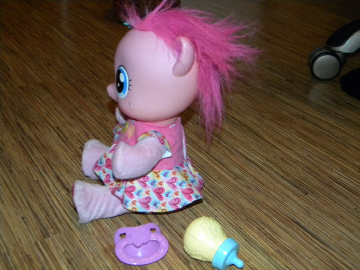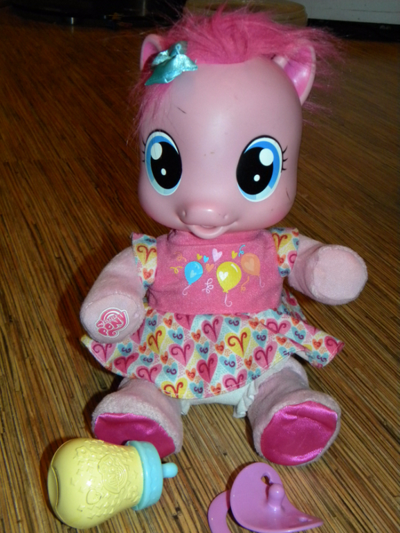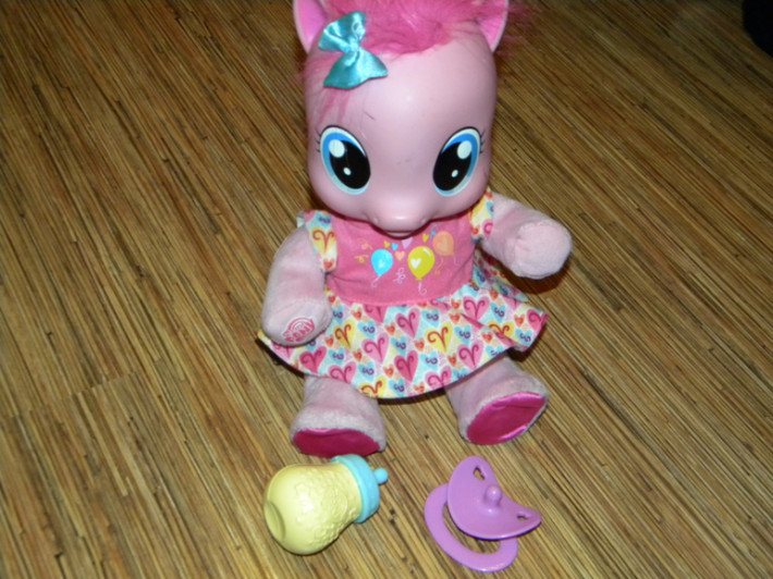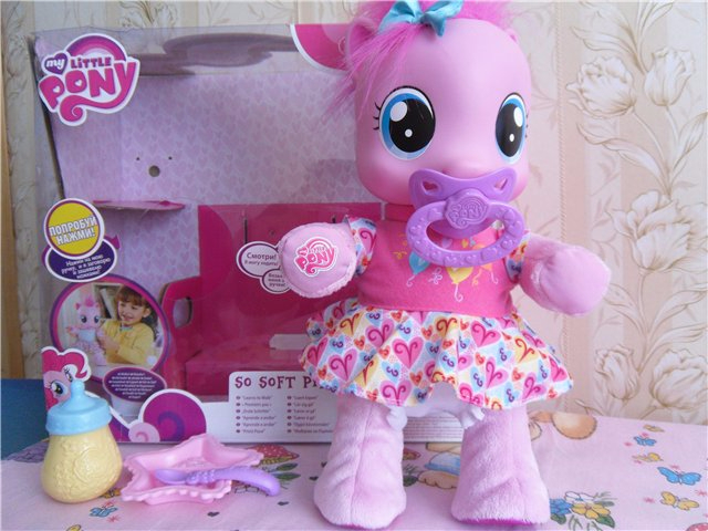 6. Интерактивная игрушка Малышка пони Пинки Пай очень многое умеет. Она говорит по-русски более 20 разных фраз, может петь песенки, пить из бутылочки. Но самое интересное, что Пони умеет не только разговаривать, но и ходить. Если выпрямить пони ножки и подержать ее за ручки, она пойдет! Походка у пони очень напоминает походу маленьких деток, так и хочется ее поддержать! В наборе к Пинки Пай идет целый комплект аксессуаров - бутылочка для кормления и пустышка. Пинки пай будет настоящей любимицей вашей девочки! Ведь у нее такие выразительные глаза и такой очаровательный бантик на голове. Пони выполнена из разных материалов - голова резиновая, а все остальное - мягкое. Высота игрушки 35 см в положении стоя и 25см в положении сидя. Состояние отличное, все функции выполняет , без коробки,с бутылочкой и соской. Цена 1200руб. Сегодня в Катюше такую видела за 3600руб. ПРОДАНА