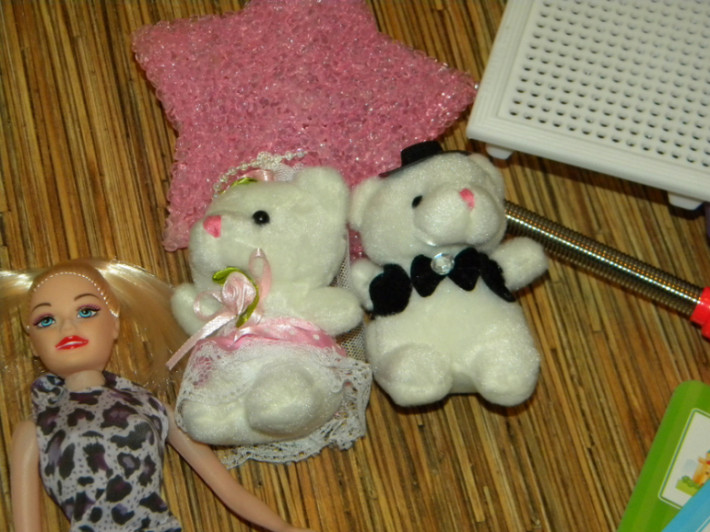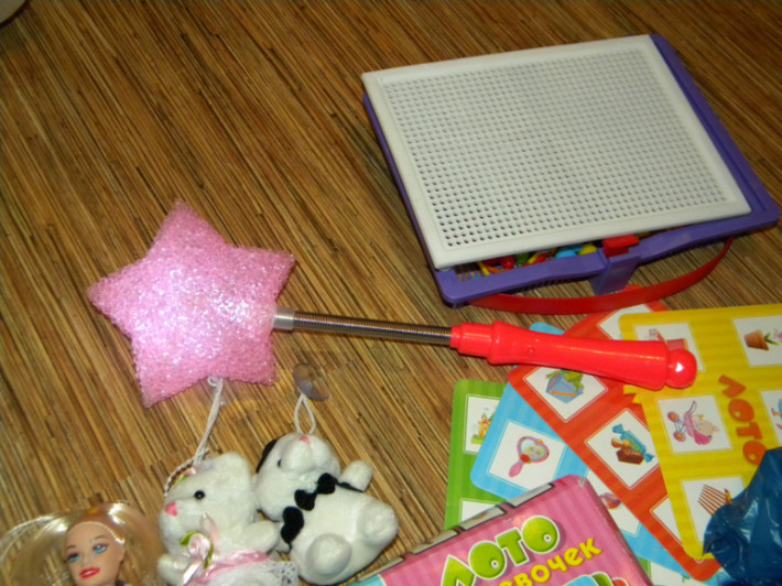 8. Набор игрушек (всё что есть на фото) .Мозаика, лото для девочек в идеале . Волшебная палочка в идеале , светится в трёх вариантах. Мишки жених и невеста новые с бирками. Куколки самые простенькие. Цена набора 400руб.