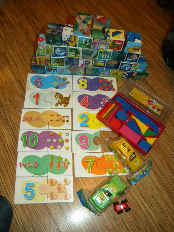11. Набор игрушек ( все , что есть на фото) Расносортные кубики с картинками и буквами. Пазлы , для восприятия цифр и счёта( 3 карточки не хватает). 2 машинки новые в упаковках. Сотер фигурки, цифры, счётные палочки , развивающий наборчик. Цена набора 300руб.