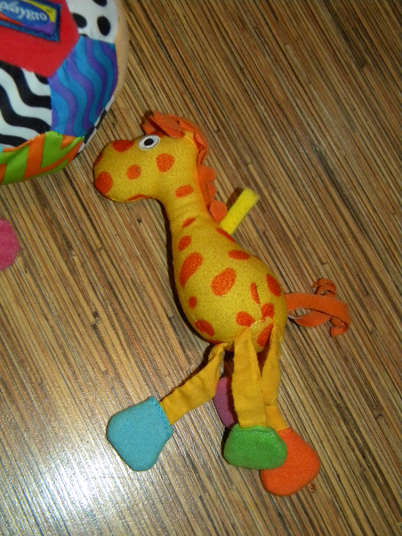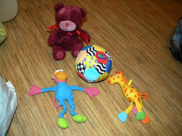 13. Набор игрушек . Мячик мягкий, внутри погремушка, игрушки- погремушки Tiny Love для коврика или на коляску. Мишка озвученный , рассказывает стишок. Цена набора 500руб.