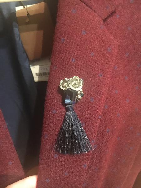 Жакет приталенного силуэта из трикотажа в горошек. Отрезной по линии талии с карманами в рамку с клапаном и застегивающийся на две пуговицы. Отделка из замши в нижнем воротнике и кармане. Рукава со шлицей по низу. Украшение-брошь в комплекте. На подкладке.