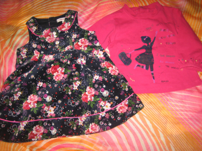 сарафан и кофта за комплект 500 рублей, маркировка 6 мес. На сарафане из двух пуговиц выпал перламутр