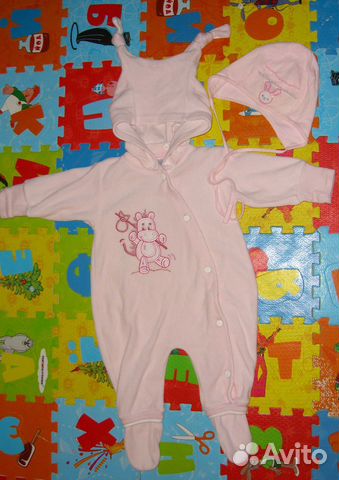 К этому комбинезончику есть шапочка 100% хлопок Jamiks (Польша) - розовая с апликацией зайчик. Размер на 6 мес. (р.68). Но реально можно начинать носить намного раньше 6 мес. 100 руб.