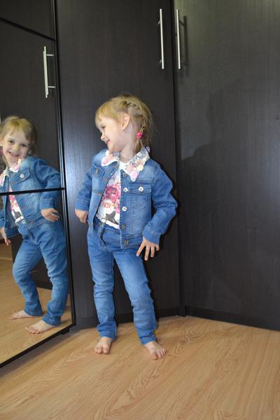 Костюм тройка, куртка (съемный воротник с розочками и камнями) и лонг (рисунок со стразами и брошкой-бантиком) в отличном состоянии, на джинсах немного заметные затяжки.