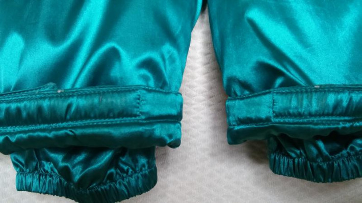2.На правой брючине потертость, размером в два рубля. На общем фоне не заметна, так как он весь переливается и блестит.