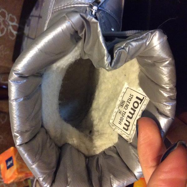 Сапожки одевали зимой на колготки,ножки теплые!внутри утеплитель похож на овчинку!б/у не часто
