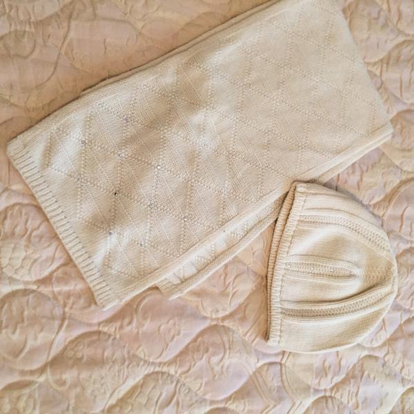 100% шерсть, не колется, цвет молочный, на девочку 10+- лет.