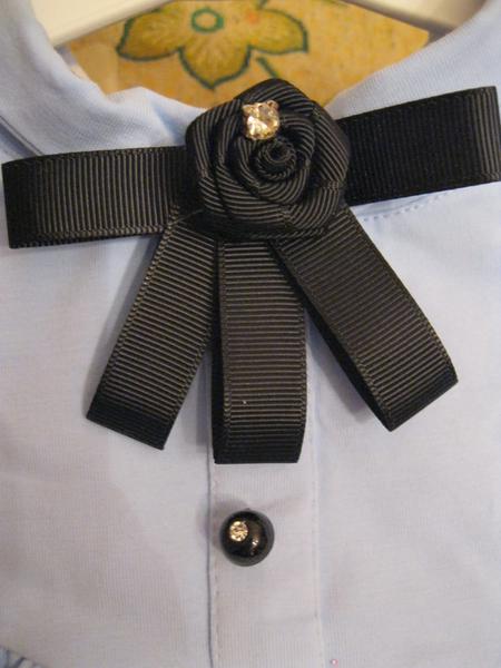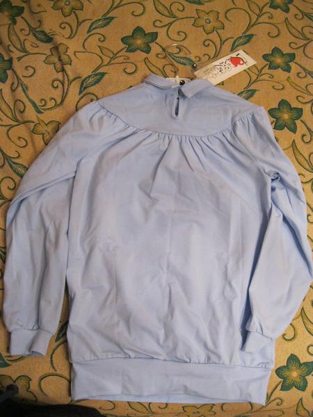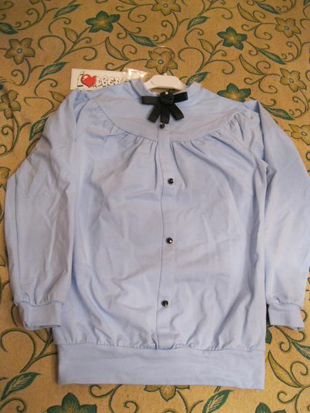 Новая, с бирками. Блузка свободного кроя. Застегивается на одну пуговицу на спине. Спереди имитация. Брошь снимается, пуговки со стразиками. Подойдет и к юбке, и к брюкам. Можно и в школу, и на отдых.