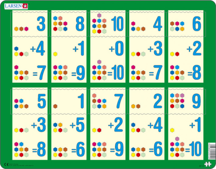 Пазл "Сложение 1-10b" относится к серии "Математика" и ориентирован на детей от 4 лет. Сам пример отпечатан на картоне, а детям необходимо найти правильный ответ. Данный пазл является прекрасным дополнением к "Сложение 1-10а" и "Сложение 1-10c". Многообразие форм вырубки и различные размеры отдельных элементов способствуют развитию мелкой моторики у малышей. Сделанные из высококачественного трехслойного картона, они не деформируются и легко берутся в руки. Все пазлы снабжены специальной подложкой, благодаря чему их удобно собирать.
