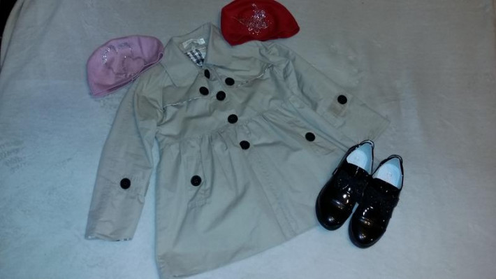Плащик чуть утепленный на рост 130см,б/у мало,состояние отличное(носили очень мало),на рост 130 прям совсем как раз,в школу идеально!Китай,сшито все отлично ,цвет бежевый как на первом фото!