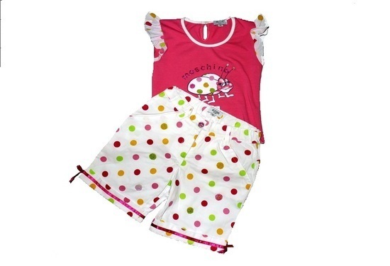13. Костюмчик Moschino. Белые тканевые шортики в разноцветный горох,а между ним расшит горошинками из цветного биссера, футболочка трикотажная, божья коровка со стразиками . Талия регулируется. Состав 100% хлопок. Размер 7л.(122см.). Цена 1000р.