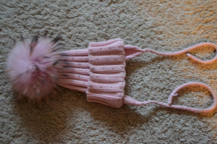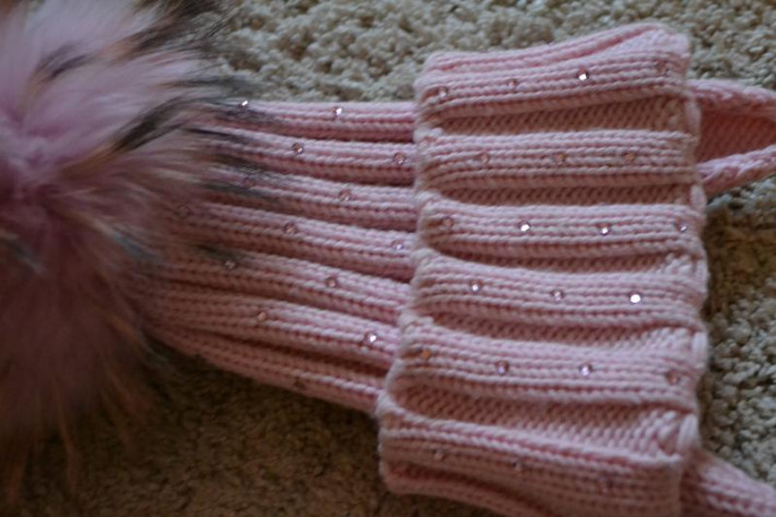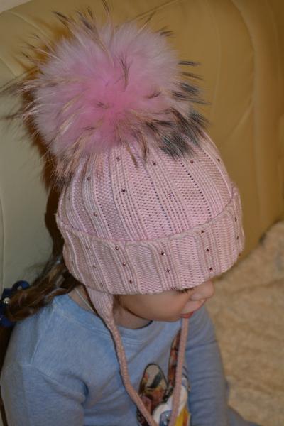 Огромный розовый игольчатый помпон. Шапка очень теплая, шерсть-итальянский меринос.Вся усыпана нежно-розовыми стразами. Купили здесь, на ББ, одели 2 раза, т.к. есть еще много других шапок, в том числе розовых.. А сейчас, на ОГ 54,5 см уже мала