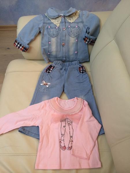 Новый джинсовый костюм тройка. Размер стоит 100см. Куртка: Длина-35см, Ширина-28см. Брюки: Длина-47см, шаговый -31см, Обт-56см. Цена 700р