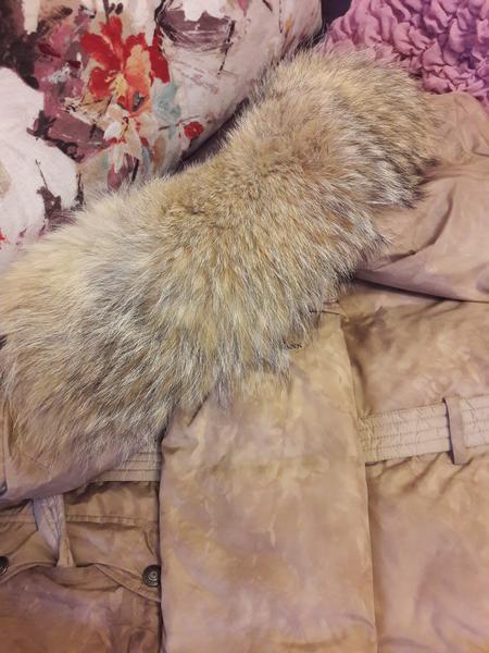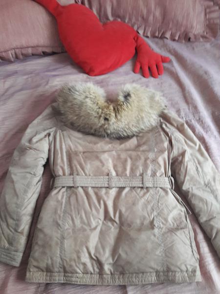 Пуховик Б.у размер S. Тёплый. Шикарная опушка, подойдёт подростку. Цвет бежевый с эффектом разводов.