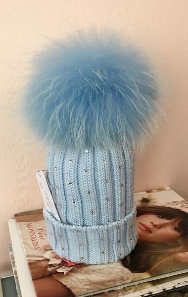 Новая Catya р.6, россыпь страз. Нежно-голубая, помпон енот-xl размер. 100 % меринос. Цена 3800 р, почта за счёт покупателя.