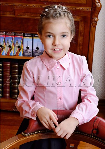 Описание: Блузка классического кроя для школьниц, выполнена из двух тканей компаньонов: однотонной и с цветочным рисунком. Рукава длинные на манжетах. Воротник отложной, на стойке. Стойка, манжеты и планка для пуговиц выполнены из ткани с принтом