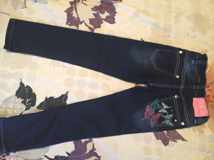 Джинсы. Размер 116. В очень хорошем состоянии (надеты раза 2, только кнопки сзади потерлись), коленки специально окрашены светлее. Куплены в Турции, очень хорошее качество, мягкие, тянутся. 500руб.