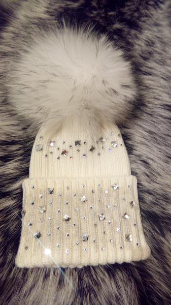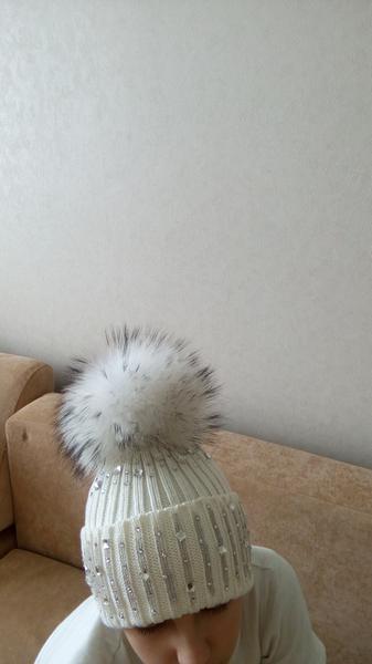 Цвет белый, серебряное напыление,стразики горят!!! Большой помпон енот!
