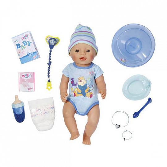 Интерактивная кукла мальчик Baby Born, ростом 43 см., принесет радость Вашему ребенку и подарит незабываемое время игры! Интерактивный малыше совсем как живой: пьет из бутылочки водичку, плачет слезками, ест кашку, ходит в туалет на горшочек или памперс (при нажатии на пупочек).. А после насыщенного дня уложить спать, положив на спинку. Спойте колыбельную, и малыш закроет глазки и уснет. В куклу встроен специальный чип позволяющий активировать звуковые и световые функции дополнительных интерактивных аксессуаров (кабриолет, скутер, кухня, пони, унитаз, спальный мешок).