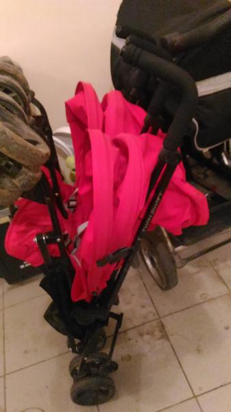 Продается коляска для двойни Инглизина, в хорошем состоянии, б/у год но стояла 2 года в колясочной, требуется чистка (пыльная). Цвет-красный. Все рабочее, дефектов нет. Корзина для продуктов рассчитана на 3 кг, "плавающие" колеса, которые можно заблокировать, ремни безопасности, 4 положения спинки, капюшон складывается. Коляска рассчитана на возраст от 6 мес и до 3 лет, весом до 15 кг.