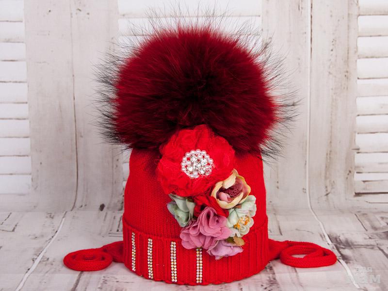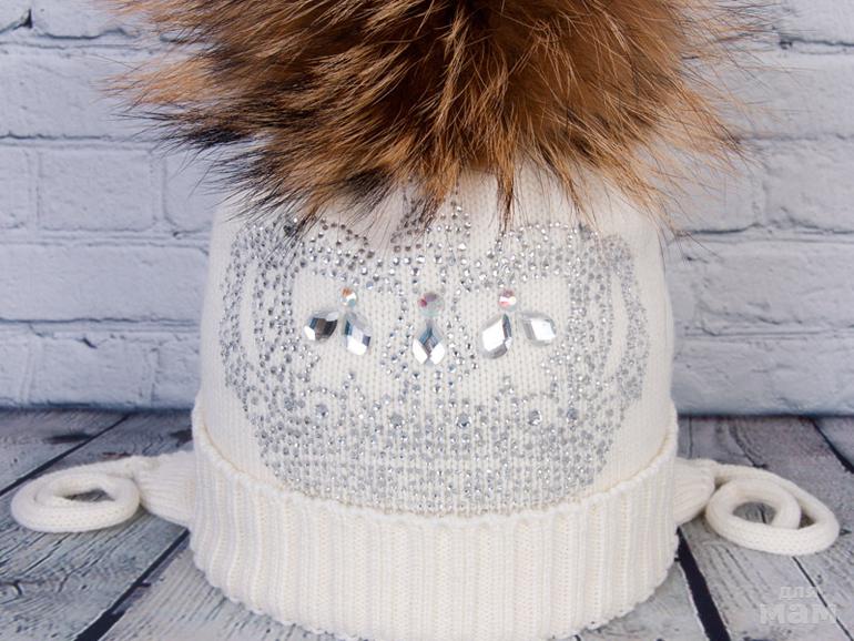 Главным украшением являются полоски из страз на резинке. Дополняет шапочку помпон из натурального меха енота.