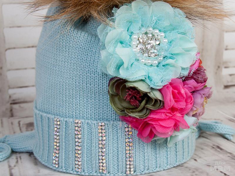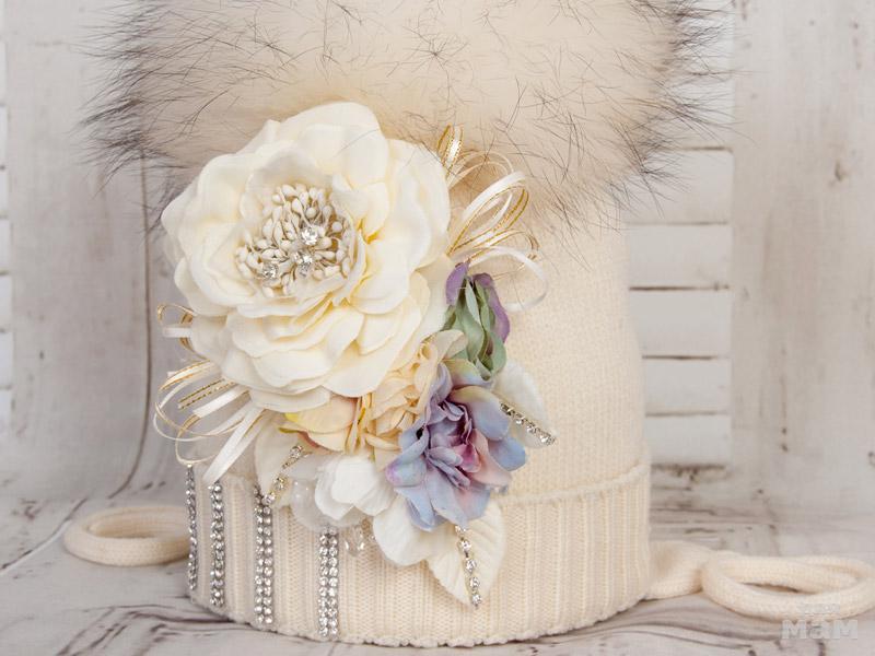 Шапочка украшена стильной композицией из цветов и полосками из страз