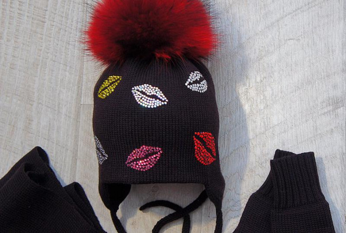 Зимний комплект в шоколадном цвете с губками, нитка 100% шерсть мериноса Италия украшенная губками из страз асфур . мех енота 22-23см Шарфик 165см ширина 17см .