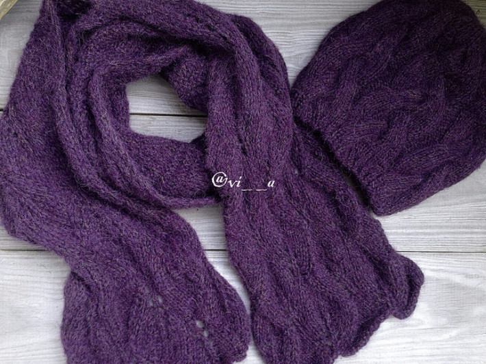 Комплект цвета спелой сливы в наличии, Шапка с косами размер универсальный 54-58+шарф