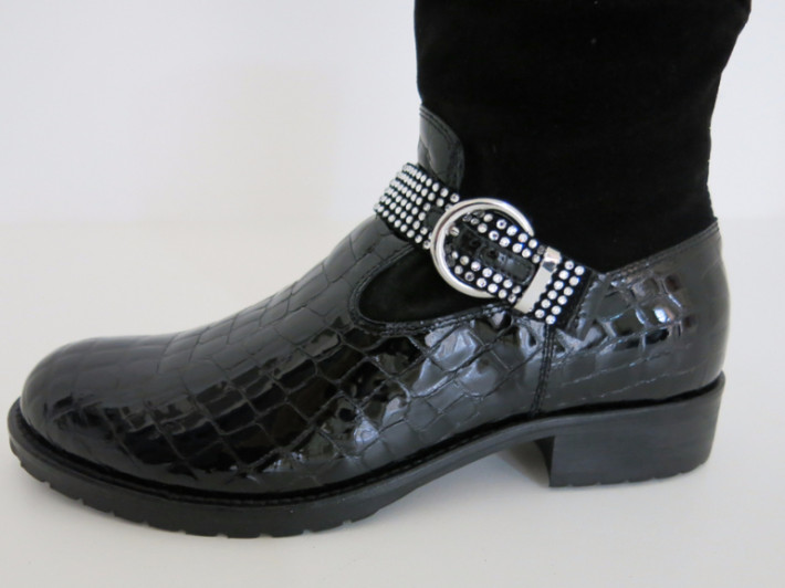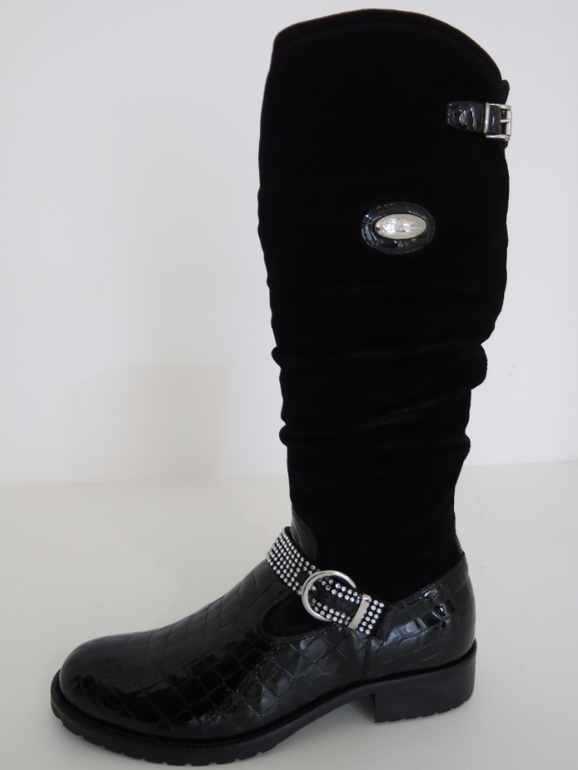5) Красивые Черные сапоги Miss Blumarine ,верх замша с лаковыми вставками,низ лак под крокодиловую кожу,ремешок в стразах .Размер 39
