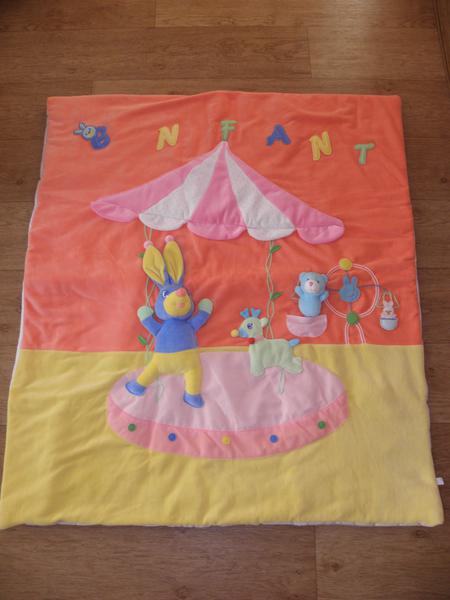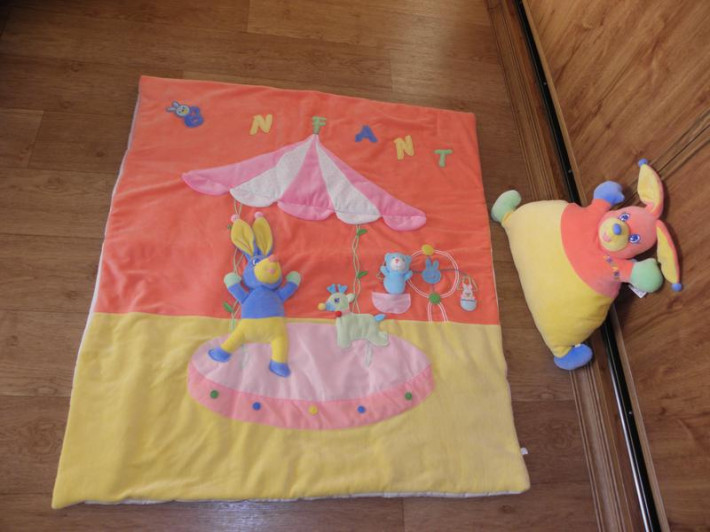 Наполнитель полое силиконизированное волокно. Самое популярное и современное на сегодняшний день! Внутренняя сторона - хлопок. Одеяло можно использовать и как игровой коврик, малышу будет интересно поиграть с зайчиком или мишкой (при нажатии на них они пищат)
