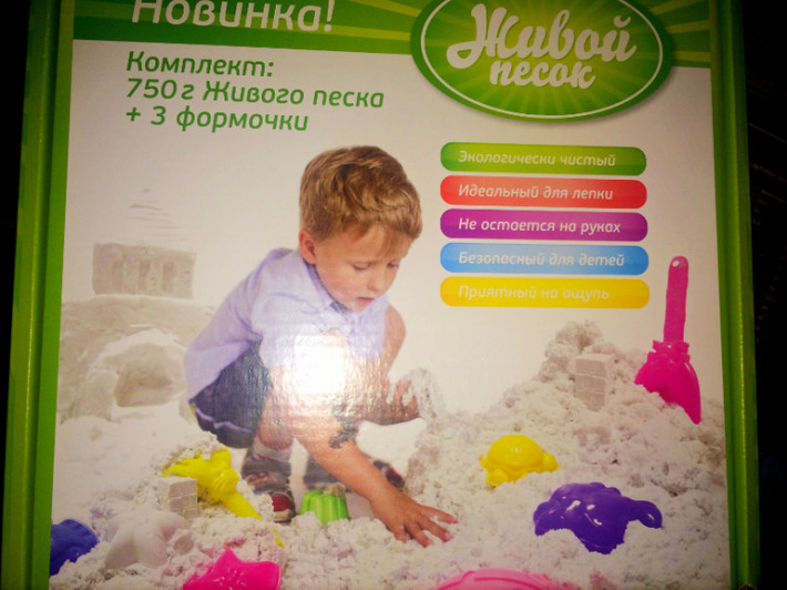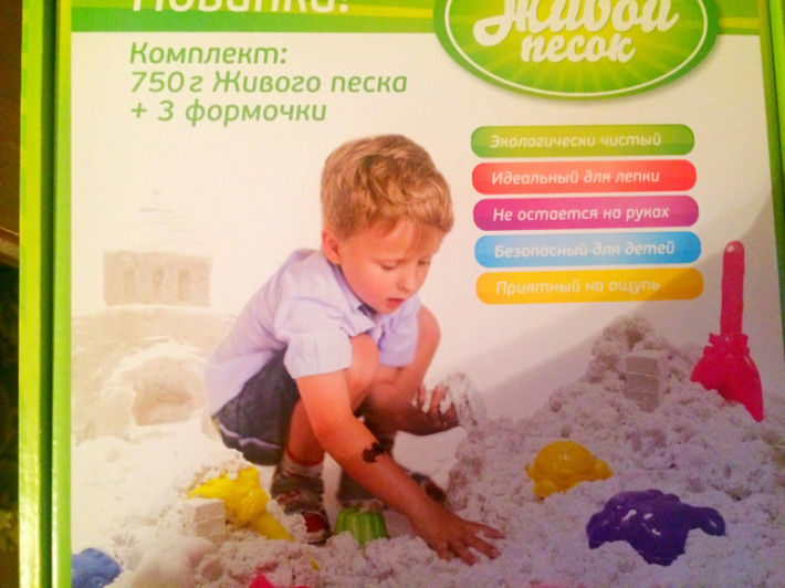 Воздушная масса, очень мягкая, податливая, объемная. Живой хорошо мять пальчиками, перебирать, пересыпать. Прекрасно лепится, хорошо держит форму. Экологически безопасный и нетоксичный, состоит из натуральных компонентов. Антибактериальный, в его составе не могут жить микробы и бактерии. Полностью растворяется в воде. Легко убирается.
