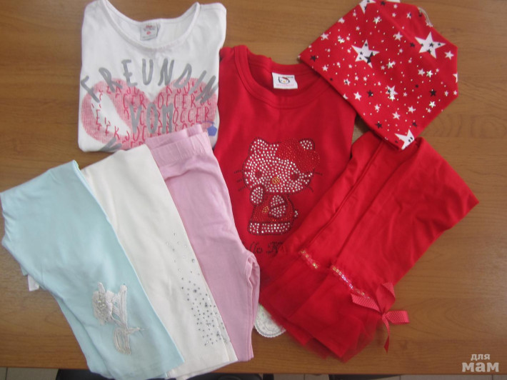 пакет 3) легги Санта барбара новые + футболка китти нов +шапочка нов+ футба и трое леггинсов (на одних есть незначит нюанс, фото в личку) 110/116 -1000 руб