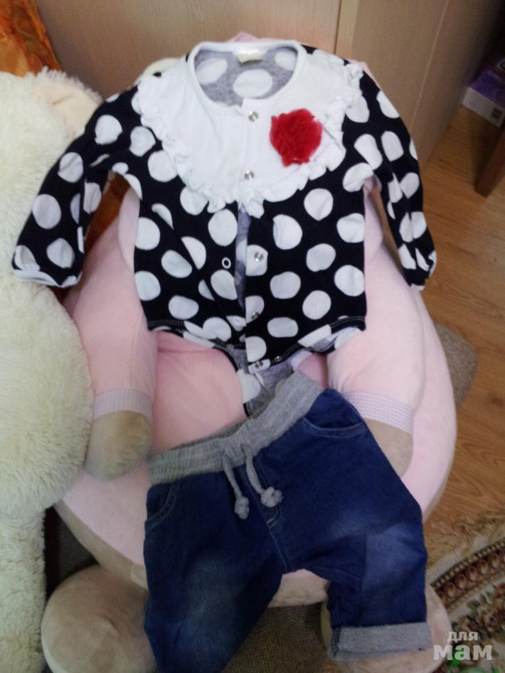 20. Кофточка велюровая -68-74 размер и Нарядное боди из интерлока в горох. Фирма Baby boom - 74 размер. Отрезная кокетка декорирована рюшей и цветком из красного шифона - по 250 рублей каждый