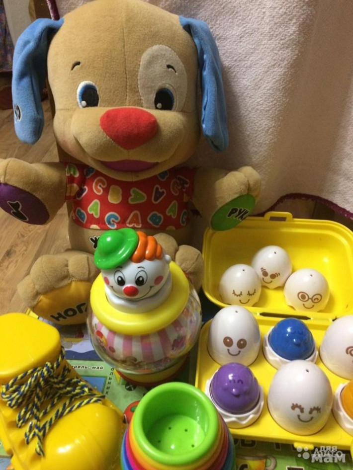 Щенок и горшок Fisher Price, цыплята Tomy, кубики, 2 пирамидки, неволяшка, клоун-Юла на присоске, погремушка