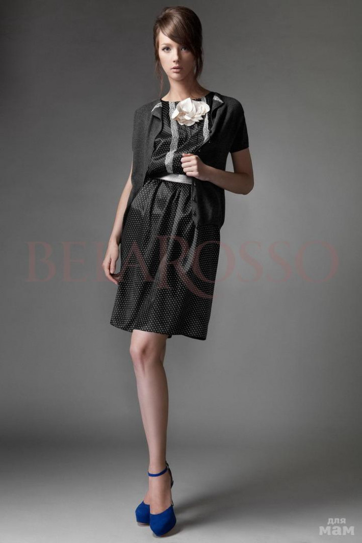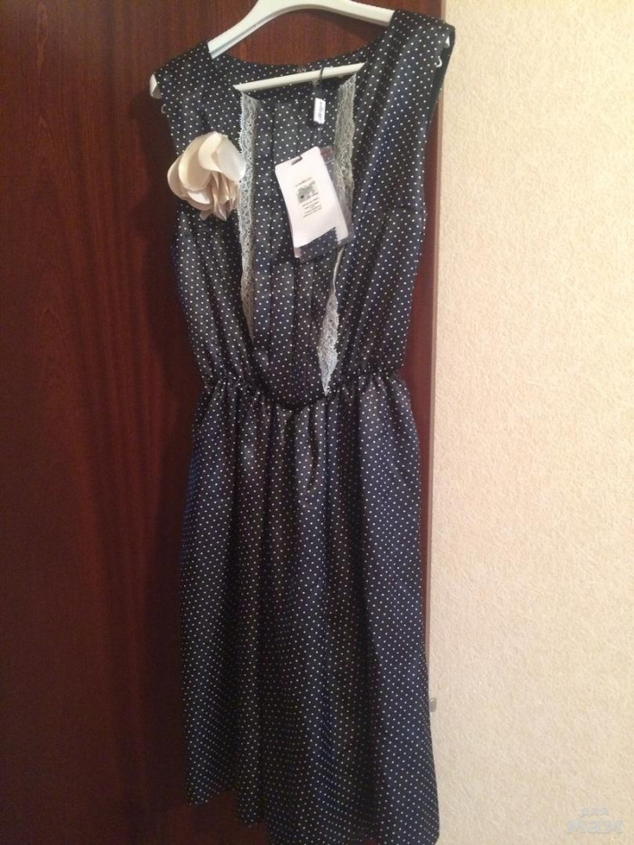 Новое платье Моцарт с биркой. Размер 46. Пояса нет и не было, как и верхней кофточки))) Оно без рукавов, живое фото сделаю позже) Черное в горох с брошью.