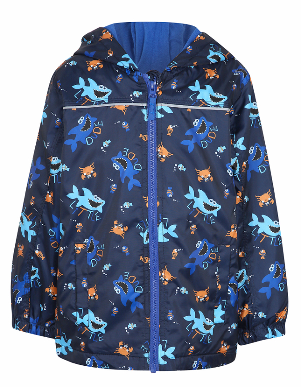 Куртка -ветровка с капюшоном на флисовой подкладке фирмы George. Верх - болоневая ткань, внутри куртки и в капюшоне флис , внутри рукавов подкладочная ткань. Синяя с яркими акулами и крабами, застежка-молния, 2 кармана на кнопках по бокам. Состав полиэстер. Размер 2-3г