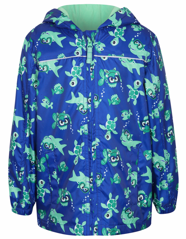 Новая Куртка -ветровка с капюшоном на флисовой подкладке фирмы George. Верх - болоневая ткань, внутри куртки и в капюшоне флис , внутри рукавов подкладочная ткань. Ярко-синяя с морскими обитателями, 2 кармана по бокам. Состав полиэстер. Размер 12-18мес (80-86)