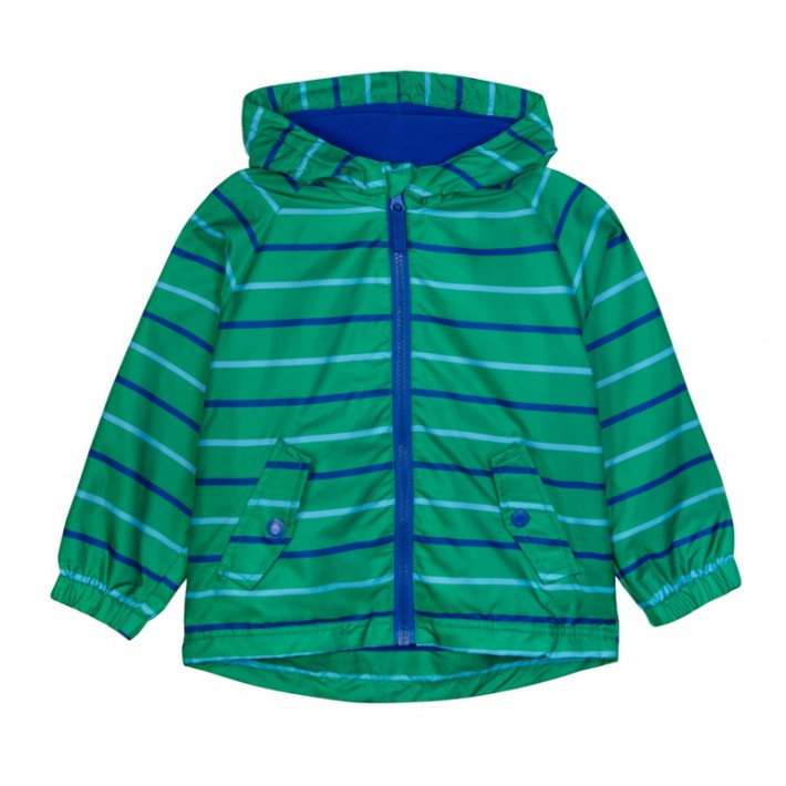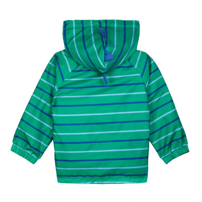 Новая Куртка -ветровка с капюшоном на флисовой подкладке. Верх - болоневая ткань, внутри куртки и в капюшоне флис , внутри рукавов подкладочная ткань. Ярко-зеленая, синие, голубые полоски, застежка-молния, 2 кармана на кнопках по бокам. Сверху на капюшоне шипы, как у динозавра. Состав полиэстер. Размер 18-24мес (86-92) 1100руб